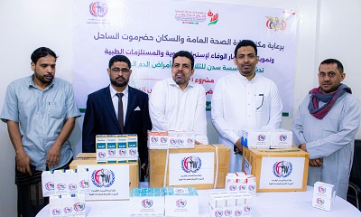 دشن الدكتور أحمد محمد بن نويصر المدير العام لمكتب وزارة الصحة العامة والسكان بساحل حضرموت بمعية الأستاذ سالم باجحاو المدير التنفيذي لمؤسسة سدن للثلاسيميا وأمراض الدم الوراثية و الدكتور منيف باتيس رئيس مجلس إدارة وكالة ثمار الوفاء للأدوية والمستلزمات الطبية بمقر المؤسسة بالمكلا مشروع توزيع الأدوية الأساسية لمرضى الثلاسيميا وأمراض الدم الوراثية بتمويل من وكالة ثمار الوفاء للأدوية والمستلزمات الطبية.