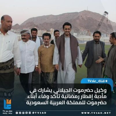 شارك وكيل محافظة حضرموت الأستاذ حسن الجيلاني، مساء اليوم، في مأدبة الإفطار الرمضانية التي أقامها عدد من المسؤولين المدنيين والعسكريين والأمنيين، إلى جانب شخصيات سياسية واعتبارية واجتماعية وقيادات عسكرية وأمنية ووجهاء وشباب من أبناء محافظة حضرموت، تحت شعار “حضرموت.. روح المبادرة ووطن الوفاء”، وذلك تأكيدًا على روح الوفاء التي يكنها أبناء حضرموت للمملكة العربية السعودية وتقديرًا لمواقفها الداعمة للمحافظة واليمن عمومًا، في أجواء رمضانية بمدينة المكلا.